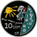 | Аверс: государственный герб, эмблема ЕврАзЭС, 6 стилизованных цветков, надпись на кирг. Аруулук уялаган балдар дүйнөсү и год выпуска монеты. Реверс: детский рисунок[3], номинал, проба и масса металла, надпись на рус. Мир наших детей. Тираж: 3000 шт. Отчеканена на Санкт-Петербургском монетном дворе. | ||