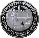| Аверс: государственный герб в обрамлении солнечных лучей, год выпуска монеты. Реверс: фигура женщины-матери, Вечный огонь и элементы мемориального комплекса «Победа» на фоне стилизованного изображения юрты и гор, орнамент в виде солнечных лучей и колосьев, номинал, проба и масса металла, надписи на кирг. УЛУУ ЖЕҢИШКЕ 60 ЖЫЛ и рус. 60 ЛЕТ ВЕЛИКОЙ ПОБЕДЕ. Масса: 28,28 г. Диаметр: 38,60 мм. Тираж: 1000 шт. Отчеканена на Кремницком монетном дворе. | ||