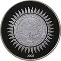 | Аверс: герб Киргизии, название серии на кирг. ЭГЕМЕН КЫРГЫЗ РЕСПУБЛИКАСЫНА 20 ЖЫЛ, год чеканки на стилизованном изображении гор, орнамент. Реверс: изображение пика Победы, его название и высота на рус. Пик Победы 7439м и кирг. ЖЕҢИС ЧОКУСУ, номинал на стилизованном изображении гор, орнамент. | ||