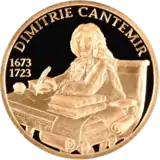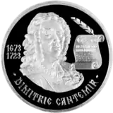 | Аверс: номинал, герб и название государства, год выпуска. Реверс: Кантемир, сидящий за столом, годы его жизни (1673—1723) и имя на молд. DIMITRIE CANTEMIR. Гурт: гладкий. Номинал: 100 леев. Масса: 7,8 г. Диаметр: 24 мм. Тираж: 1000 шт. | ||