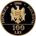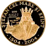 | Аверс: номинал, герб и название государства, год выпуска. Реверс: портрет Стефана III на фоне монастыря, даты юбилея и имя на молд. · 1504 · 2004 · ȘTEFAN CEL MARE ȘI SFÎNT, надпись на молд. 500 de ani de la trecerea în eternitate. Гурт: гладкий. Номинал: 100 леев. Масса: 7,8 г. Диаметр: 24 мм. Тираж: 300 шт. | ||
