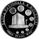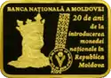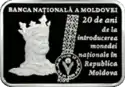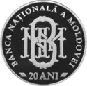 | Аверс: номинал, герб и название государства, год выпуска. Реверс: эмблема НБМ, надпись на молд. BANCA NAȚIONALĂ A MOLDOVEI 20 ANI. Гурт: рубчатый. Номинал: 100 леев. Материал: серебро-999. Масса: 31,1 г. Диаметр: 37 мм. Тираж: 500 шт. | ||