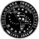 | Аверс: номинал, герб и название государства, год выпуска. Реверс: карта Молдавии с изображениями различных национальных символов, 25 звёзд, ветви дуба, надписи на молд. PROCLAMAREA INDEPENDENȚEI 1991—2006 и молд. DIN EUROPA — SPRE EUROPA. Гурт: гладкий. Номинал: 100 леев. Материал: серебро-925. Масса: 31,1 г. Диаметр: 37 мм. Тираж: 500 шт. | ||