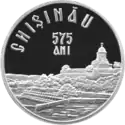 | Аверс: номинал, герб и название государства, год выпуска. Реверс: пейзаж с изображением Мазаракиевской церкви, надпись на молд. CHIȘINĂU 575 ANI. Гурт: рубчатый. Номинал: 100 леев. Материал: серебро-999. Масса: 31,1 г. Диаметр: 37 мм. Тираж: 1000 шт. | ||