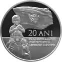 | Аверс: номинал, герб и название государства, год выпуска. Реверс: изображение мужчины с ребёнком на плечах, государственный флаг, надпись на молд. 20 ANI DE LA PROCLAMAREA INDEPENDENȚEI REPUBLICII MOLDOVA. Гурт: рубчатый. Номинал: 100 леев. Материал: серебро-999. Масса: 31,1 г. Диаметр: 37 мм. Тираж: 1000 шт. | ||
