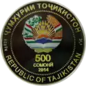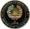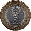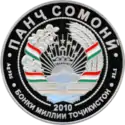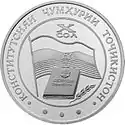 | Реверс: флаг и конституция Таджикистана, пальмовая ветвь, надписи на тадж. • КОНСТИТУТСИЯИ ҶУМҲУРИИ ТОҶИКИСТОН • ••• и тадж. X СОЛ. Номинал: 5 сомони. Масса: 7,5 г. Диаметр: 26,5 мм. Толщина: 1,6 г. Тираж: [уточнить] | ||