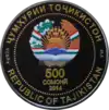 | Аверс: герб и название государства на таджикском и английском языках, масса и проба металла, номинал и год выпуска монеты. Реверс: карта и конституция Таджикистана, надпись на тадж. XX СОЛ на фоне лучей Солнца, колонна и растительный орнамент, надпись «Конституция Республики Таджикистан» на тадж. КОНСТИТУТСИЯИ ҶУМҲУРИИ ТОҶИКИСТОН и англ. THE CONSTITUTION OF THE REPUBLIC OF TAJIKISTAN. Гурт: рубчатый. Отчеканена Mayer Mint GmbH Germany. Номинал: 500 сомони. Масса: 31,1 г. Диаметр: 38,61 мм. Тираж: 2000 шт. | ||