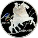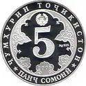 | Аверс: номинал, название банка-эмитента, масса и проба металла, герб государства, год выпуска. Реверс: изображение памятника Исмаилу Самани в Душанбе, название города, эмблема ЕврАзЭС. Гурт: рубчатый. Отчеканена на Казахстанском монетном дворе. Номинал: 5 сомони. Масса: 31,1 г. Диаметр: 38,61 мм. Тираж: 2000 шт. |