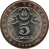 | Реверс: Дворец Нации с государственным флагом на фоне карты Таджикистана, надписи на тадж. ИСТИҚЛОЛИЯТИ ТОҶИКИСТОН и тадж. XV-СОЛ 1991—2006. Номинал: 5 сомони. Масса: 7 г. Диаметр: 26,5 мм. Толщина: 1,85 г. Тираж: 100 000 шт. | ||