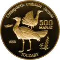 | Аверс: портрет Туркменбаши, надпись на туркм. TÜRKMENISTANYÑ PREZIDENTI SAPARMYRAT NYҰAZOW. Реверс: изображение животного, его название на лат. Chlamydotis undulata и туркм. TOGDARY, номинал и год выпуска монеты. Гурт рубчатый. Номинал: 500 манатов. Материал: золото-999. Масса: 47,54 г. Диаметр: 38,61 мм. Тираж: 100 шт. | ||