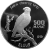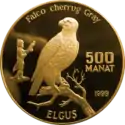 | Аверс: портрет Туркменбаши, надпись на туркм. TÜRKMENISTANYÑ PREZIDENTI SAPARMYRAT NYҰAZOW. Реверс: изображение животного, его название на лат. Falco cherrug и туркм. ELGUŞ, номинал и год выпуска монеты. Гурт рубчатый. Номинал: 500 манатов. Материал: золото-999. Масса: 47,54 г. Диаметр: 38,61 мм. Тираж: 100 шт. | ||