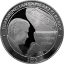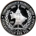 | Аверс: портрет Туркменбаши, оливковые ветви, надпись на туркм. TÜRKMENISTANYŇ ILKINJI WE ÖMÜRLIK PREZIDENTI SAPARMYRAT NYÝAZOW. Реверс: Монумент нейтралитета, оливковые ветви, номинал и даты «1995 2000» на фоне карты Туркмении, название банка-эмитента, надпись на туркм. TÜRKMENISTAN BÄŞ ÝYL BITARAP. Гурт рубчатый. Номинал: 1000 манатов. Материал: золото-917. Масса: 7,98 г. Диаметр: 22,05 мм. Тираж: [уточнить] |
