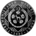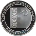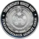 Аверс: центральный элемент штандарта президента Туркмении, оливковые ветви, название банка-эмитента, год выпуска монеты.