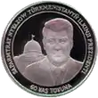 | Аверс: Туркменбаши на фоне Президентского дворца в Ашхабаде, надпись на туркм. SAPARMYRAT NYҰAZOW TÜRKMENISTANYŇ ILKINJI PREZIDENTI и туркм. 60 ҰAŞ TOҰUNA. Реверс: фрагмент штандарта президента Туркмении, название банка-эмитента, надпись на туркм. ҰUBILEҰ MONETASY. Гурт [уточнить]. Номинал: без номинала. Масса: 50,00 г. Диаметр: 38,61 мм. Тираж: 1000 шт. |
