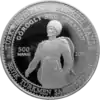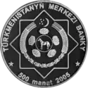 | Аверс: герб Туркмении, название банка-эмитента, номинал монеты, масса и проба металла. Реверс: Олимпийский стадион Ашхабад, надписи на туркм. AŞGABAT OLIMPIÝA STADIONY, туркм. ÝAPYK BINALARDA WE SÖWEŞ SUNGATY BOÝUNÇA V AZIÝA OÝUNLARY. Гурт Рубчатый. Номинал: 500 манатов. Масса: 28 г. Диаметр: 38,61 мм. Тираж: [уточнить] |
