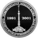 | Аверс: портрет Туркменбаши, оливковые ветви, надпись на туркм. TÜRKMENISTANYŇ ILKINJI WE ÖMÜRLIK PREZIDENTI SAPARMYRAT NYÝAZOW. Реверс: Монумент Независимости, даты «1991 2001», название банка-эмитента, надпись на туркм. GARAŞSYZ BITARAP TÜRKMENISTANA 10 ÝYL. Гурт [уточнить]. Номинал: 1000 манатов. Материал: золото-917. Масса: 7,98 г. Диаметр: 22,05 мм. Тираж: 1000 шт. | ||