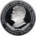 Аверс: портрет Туркменбаши, оливковые ветви, надпись на туркм. TÜRKMENISTANYŇ ILKINJI WE ÖMÜRLIK PREZIDENTI SAPARMYRAT NYÝAZOW.
