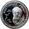 Реверс: по центру — изображение деятеля, его имя с добавлением TÜRKMEN, номинал, год выпуска монеты; во внешнем круге — название банка-эмитента, название серии на туркм. BEÝIK TÜRKMEN ŞAHSYÝETLERI и арочный орнамент.