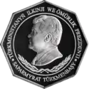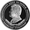 Аверс: портрет Туркменбаши, надпись на туркм. TÜRKMENISTANYÑ PREZIDENTI SAPARMYRAT NYҰAZOW.