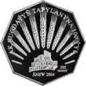 | Аверс: портрет Туркменбаши, оливковые ветви, надпись на туркм. TÜRKMENISTANYŇ ILKINJI WE ÖMÜRLIK PREZIDENTI SAPARMYRAT TÜRKMENBAŞY. Реверс: изображение мечети в Аннау с отходящими от неё лучами в виде колосьев пшеницы, номинал монеты, надпись на туркм. AK BUGDAÝNYŇ TAPYLANYNA 100 ÝYL ÄNEW 2004. Гурт [уточнить]. Номинал: 1000 манатов. Материал: золото-917. Масса: 39,94 г. Диаметр: 38,61 мм[1]. Тираж: 260 шт. | ||