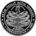 | Аверс: фрагмент президентского штандарта, надпись на туркм. XXI ASYR — TÜRKMENIÑ ALTYN ASYRY, название банка-эмитента, орнамент. Реверс: стилизованное генеалогическое древо Сапармурата Ниязова, с числом «65» в основании, надпись на туркм. BEÝIK NESLIÑ BEÝIK SERDARY, название государства, номинал и год выпуска. Гурт рубчатый. Номинал: 1000 манатов. Материал: золото-999. Масса: 155,5 г. Диаметр: 65 мм. Тираж: до 200 шт.[2] | ||