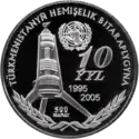 | Аверс: герб Туркмении, название банка-эмитента, год выпуска монеты. Реверс: Монумент Нейтралитета, эмблема ООН, номинал монеты, оливковые ветви, даты «1995 2005», надпись на туркм. TÜRKMENISTANYŇ HEMIŞELIK BITARAPLYGYNA 10 ÝYL. Гурт рубчатый. Номинал: 1000 манатов. Материал: золото-917. Масса: 13,0 г. Диаметр: 25,0 мм. Тираж: 1000 шт. |