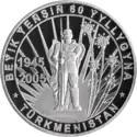 | Аверс: герб Туркмении, название банка-эмитента, номинал и год выпуска монеты. Реверс: памятник Атамурату Ниязову на фоне лучей Солнца и салюта, даты «1945 2005», название государства, надпись на туркм. BEÝIK YEŇŞIŇ 60 ÝYLLYGYNA. Гурт рубчатый. Номинал: 1000 манатов. Материал: золото-917. Масса: 39,94 г. Диаметр: 38,61 мм. Тираж: 500 шт. | ||