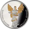 | Аверс: изображение аиста, который вьёт гнездо, название государства, год выпуска, по краю — 12 звёзд. Отчеканена на Литовском монетном дворе. | ||