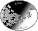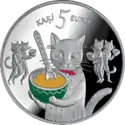 | Аверс: пять котов с ложками и мисками, надпись на латыш. KAĶI 5 EURO — «котов 5 евро». Реверс: спящие на кровати коты: Мурис, Нурис, Инцис, Минцис и Пунцис, их имена на латышском и год впуска. Гурт гладкий с надписью на латыш. LATVIJAS BANKA ♦ LATVIJAS REPUBLIKA ♦ — «Банк Латвии ♦ Латвийская Республика ♦». Отчеканена на Литовском монетном дворе. Масса: 31,47 г. Диаметр: 38,61 мм. Тираж: 10 000 шт. | ||