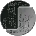 | Аверс: фрагменты стихов поэтов с их подписями, номинал, название государства и год выпуска. Реверс: фигуры поэтов и их имена на латыш. Rainis и Aspazija. Гурт гладкий. Отчеканена на Литовском монетном дворе. Масса: 31,47 г. Диаметр: 38,61 мм. Тираж: 7000 шт. | ||
