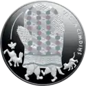 | Аверс: сцена (дом, ёжик со стадом свиней) и название сказки на латыш. EŽA KAŽOCIŅŠ, номинал. Реверс: сцена из сказки: принцесса с ёжиком в переднике, название государства и год выпуска. Гурт гладкий. Отчеканена на Литовском монетном дворе. Масса: 28,28 г. Размеры: 42×35 мм. Тираж: 10 000 шт. | ||