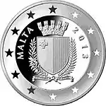 На аверсе монеты изображён герб Республики Мальты. Слева от герба по окружности надпись «MALTA», справа указан год выпуска — 2013. На реверсе монеты изображена монета времён Великого магистра Мальтийского ордена Жана Паризо де ла Валетты.[19]. | ||||