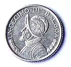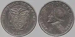 Медь, плакированная медно-никелевый сплавом. Диаметр 17.90 мм. | В центре герб Панамы. В верхней части надпись полукругом REPUBLICA DE PANAMA, в нижней год выпуска. | В центре изображение конкистадора Васко Нуньеса де Бальбоа (1475—1517). В верхней части монеты надпись полукругом: VN · DECIMO · DE · BALBOA. | 1996, 2001, 2008 | |
