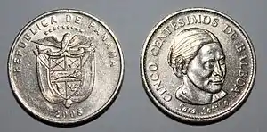 Медно-никелевый сплав. Диаметр 21.20 мм, толщина 1.95 мм. | В центре герб Панамы. В нижней части год выпуска. В верхней части надпись полукругом: REPUBLICA DE PANAMA. | В центре цифра «5», под цифрой — 9 звезд, по краю монеты надпись CINCO CENTESIMOS DE BALBOA. | 1982, 1983, 1993 | |