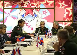 | С заместителем Министра обороны Русланом Цаликовым. Санкт-Петербург, 12 сентября 2015. | На заседании наблюдательного совета ЦСКА, 15 апреля 2015. | Передача штандарта командующему войсками ЦВО Владимиру Зарудницкому, 16 июня 2014. | Вручение дипломов воспитанникам московских военных училищ, 20 июня 2015. |