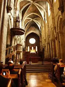 Первоначальная церковь была, вероятно, романской, но от неё ничего не сохранилось, в XII—XV веках она несколько раз перестраивалась, пока в 1486 году при Матьяше Корвине ещё одна перестройка не придала ей чисто готический облик.