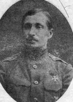 «за то, что в бою 27 августа 1914 г. у д. Тарнавки, будучи начальником пулемётной команды и находясь со своими пулемётами в кольцевом окопе, защищавшем в ночь захваченную неприятельскую позицию с сорока орудиями, своим мужеством и искусными действиями, невзирая на тяжёлое положение и большие потери, в большей степени содействовал отбитию атак германцев и австрийцев, предотвратив обход нашего фланга, и тем способствовал к удержанию нами взятых с боя орудий»[2]