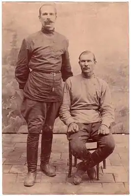 ![]() Полковник Папенгут Павел Петрович (стоит) и адъютант атамана Дутова есаул Могутный (сидит) | |