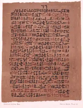 Папирус Эберса — древнеегипетское медицинское сочинение (трактат), написанное иератическим письмом на папирусе[1]. Наряду с папирусом Эдвина Смита, относится к старейшим из известных сохранившихся рукописей и, в особенности, текстов медицинского содержания. Содержит обширный список различных болезней, их симптомов, диагностику и методы лечения. В нём имеется, в частности, описание приготовления лекарств и методов лечения в областях травматологии, борьбы с паразитами, стоматологии, а также по гинекологии и контрацепции.