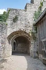 Вход внутрь главного замка прикрывали очень мощное фортификационное сооружение. Благодаря толщине стен и надёжно кладке оно неплохо сохранилось, несмотря на многократные осады и обстрелы крепости. Над внутренними воротами сохранились остатки романской замковой часовни Св. Георгия (ранее Св. Власия).