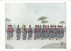 Военная форма одежды имела такой же покрой, как у французских зуавов, то есть своим покроем приближалась к алжирским местным костюмам[6], но отличалась от них цветом: серая с красной отделкой. Серо-красное кепи было заменено на североафриканский фес.