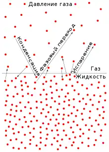 - Насыщенный пар — пар, находящийся в динамическом равновесии с жидкостью (скорость испарения равна скорости конденсации). Это означает, что при данной температуре в этом объёме не может находиться большее количество пара. Если сжимать пар, находящийся в равновесии с жидкостью под поршнем (при условии, что воздух из сосуда предварительно откачан), то равновесие будет нарушаться. Так как плотность пара в первый момент увеличится, то увеличится конденсация (из пара в жидкость начнет переходить большее количество молекул, чем из жидкости в газ). Этот процесс будет продолжаться до тех пор, пока вновь не установятся динамическое равновесие и плотность пара, а следовательно, и концентрация молекул газа не примет прежнее значение.