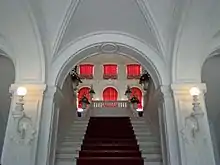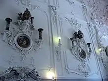 Плафон украшают произведения итальянских живописцев XVII—XVII века: центральная картина — «Суд Париса» кисти Карло Маратти — и «Юпитер и Каллисто». А на лестничных площадках посапывают «спящий амур» и «просыпающийся амур», изваянные из мрамора. Казалось бы, во дворце даже в интерьере парадной лестницы присутствует греческая скульптура. Но нет, «амуры» исполнены в 1860 году В. П. Бродзким.