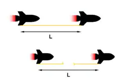 Следовательно, при описании в сопутствующей системе отсчёта расстояние между кораблями увеличивается в раз. Поскольку струна не сможет так растянуться, она порвётся.