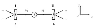 Суть опыта состоит в следующем: источник испускает два фотона в зацепленных состояниях, которые можно описать уравнением . Эти фотоны распространяются в противоположных направлениях вдоль оси , а зацеплены по осям и . Исследователь может измерить одну из компонент (, или ) спина первого фотона, но не больше чем одну за опыт. Например, для частицы 1 мы сделаем измерение по оси и получим таким образом компоненту .