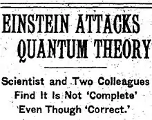 - Einstein attacks Quantum theory, The New York Times, 1935-05-04, <http://select.nytimes.com/gst/abstract.html?res=F50711FC3D58167A93C6A9178ED85F418385F9>