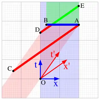 Хорошей иллюстрацией к происходящему является приведённая ниже диаграмма Минковского. Она построена в системе отсчёта сарая. Вертикальный голубой диапазон показывает пространство-время сарая, красный диапазон — пространство-время шеста. За пространство и время отвечают оси x и t у сарая и x' и t' у шеста.