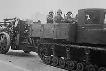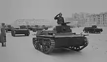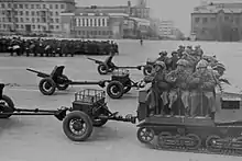 Прошли по площади 84 повозки и 119 тракторов[33], гусеничные артиллерийские тягачи Т-20 «Комсомолец» с 45-мм противотанковыми пушками, а также другие противотанковые, средние и дальнобойные орудия[35], всего 208 орудий[33]. Относительно состава и численности бронетехники, участвовавшей в параде, в источниках присутствуют разногласия. В «Строевой записке личного состава и вооружения частей гарнизона г. Куйбышева, участвующих в Параде в день 24-й годовщины Великой Октябрьской социалистической революции на площади им. Куйбышева», направленной Ворошилову начальником гарнизона Куйбышева Лукиным, указано, что в параде приняло участие 107 танков (Т-38 — 96 единиц, Т-28 — 11 единиц)[36], что заметно больше предполагавшегося количества[20]. Однако, если присутствие на параде танков Т-38 подтверждается и документально, и с помощью фото- и кинокадров, то танки Т-28 не фигурируют ни на фотографиях, ни в кинохронике парада[20]. По некоторым источникам, их вообще не имелось в округе в указанном количестве[37]. Зато на фотографиях и кинохронике присутствуют не указанные в «Строевой записке» танки Т-26, которые изначально и предполагались для участия в параде[20]. В ряде источников также указывается, что в параде принял участие как минимум один танк Т-35, причём он сохранился до настоящего времени, находится в бронетанковом музее в Кубинке, встречаются утверждения и об участии танков БТ-7[9]. В любом случае в параде участвовали только танки устаревших типов[20]. В докладе Ворошилова Сталину также указано об участии 17 (в другом источнике 14[15]) бронеавтомобилей, не обнаруженных ни на фотографиях, ни в кинохронике[5].