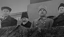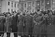 Справа от трибуны располагались иностранные дипломаты[13]. В Куйбышев были эвакуированы дипломатические представительства 22 стран (США, Великобритания, Афганистан, Китай, Бельгия, Швеция, Чехословакия, Болгария, Турция, Греция, Иран, Норвегия, Польша, Югославия, Япония, Канада, Австралия, Куба, Мексика, Монголия, Тува, Комитет национального освобождения Франции), 2 военные миссии (Великобритании и США)[26], а также иностранные корреспонденты[27]. Слева от центральной трибуны размещались около 300 приглашённых — «передовики производства, руководящие работники партийных и советских организаций»[13].