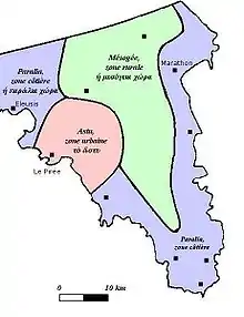Разделение Аттики на городские (розовые), внутренние (зелёные) и прибрежные (синие) зоны Клисфеном